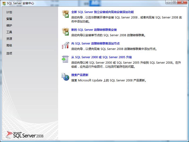 1.进行SQL Server安装中心,选择"安装"选项,在新的电脑上安装SQL2008可以直接选择“全新SQL Server独立安装或向现有安装功能",将会安装一个默认SQL实列,如下图