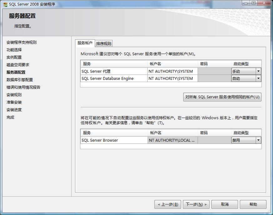 4.服务器配置,服务器配置主要是服务启动帐户的配置,服务的帐户名推荐使用NT AUTHORITY\SYSTEM的系统帐户,并指定当前选择服务的启动类型,如图