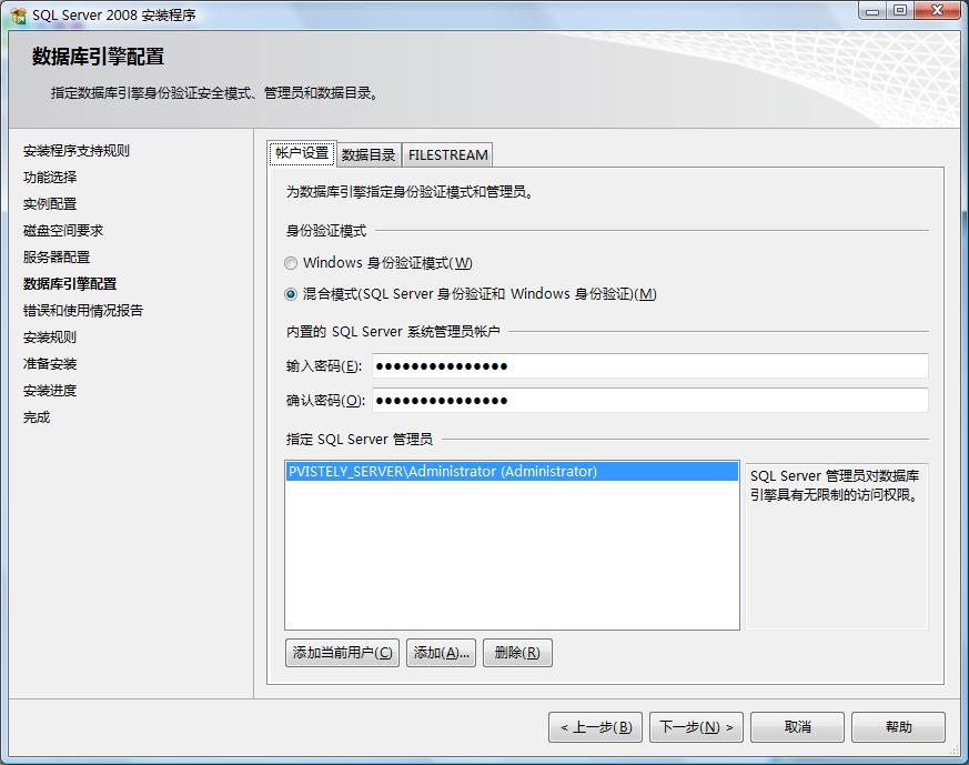 5.数据库引擎配置,在当前配置中主要设置SQL登录验证模式及账户密码,与SQL的数据存储目录,身份验证模式推荐使用混合模式进行验证,在安装过程中内置的SQL Server系统管理员帐户(sa)的密码比较特殊,SQL2008对SA的密码强度要求相对比较高,需要有大小写字母、数字及符号组成,否则将不允许你继续安装。在"指定Sql Server管理员"中最好指定本机的系统管理员administrator。如图
