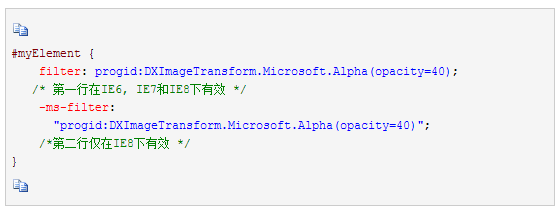 注意两行代码的不同之处:在第二行代码中,在filter属性前跟着-ms-前缀,并且属性值有加引号,这些都是语法所必须的。