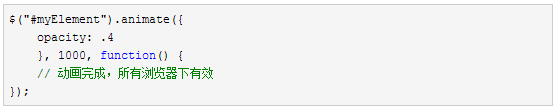 不管元素的透明度在动画开始时是多少,它都会渐变到透明度为“.4”。动画的速度通过值“1000”设定,动画时间以毫秒为单位。代码中的最后一个属性是一个可选回调函数,将在动画完成后执行。