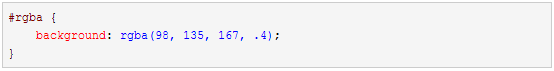 在上面的定义中,通过RGB(前三个数字)给背景设定颜色,然后最后一个是alpha设置,以执行给定颜色的透明度。这个alpha设置跟opacity 属性一样,可设定任何0到1的数字,精确得到两位小数点。数字值越大,就越接近完全不透明的颜色。