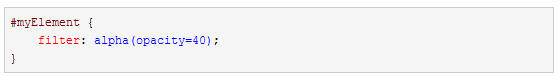 上面的CSS使用专用的filter属性来设置IE6-8透明度。对于IE6和IE7需要注意:为了使得透明设置生效,元素必须是“有布局”。一个元素可以通过使用一些CSS属性来使其被布局,有如width 和 position。关于微软专有的hasLayout属性详情,以及如何触发它,参考这里。