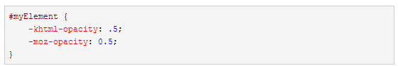 第二行使用专用属性 -moz-opacity是 为了兼容Mozilla渲染引擎的早期版本,以及追溯到Netscape Navigator。Firefox 0.9以后就不要求使用-moz-opacity属性,Firefox 3.5(现在使用Gecko引擎)已经不在支持这个属性。