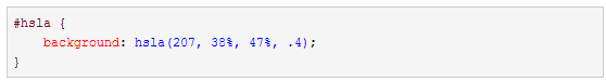 类似之前的定义,CSS3还允许使用HSLA单独设置颜色和alpha值,HSLA表示Hue(色调),Saturation(饱和度), Lightness(亮度), 和Alpha。以下是HSLA透明的例子: